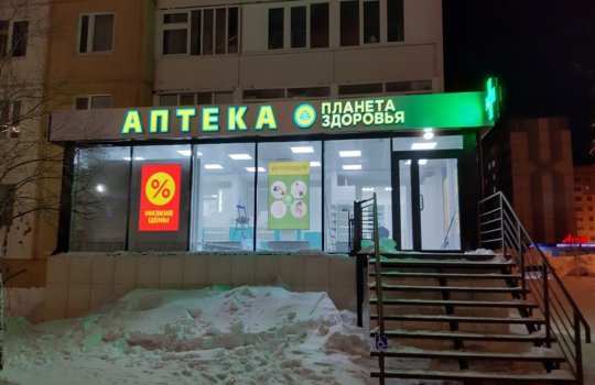Пример брендирования входа в аптеках: